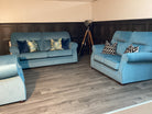 Classic elegance meets supreme comfort with the Culmore Suite. Upholstered in a soft, velvety blue fabric, this suite features generously padded backrests, curved armrests, and a timeless silhouette that adds a touch of sophistication to any home. The deep, supportive seating ensures maximum relaxation, making it perfect for cozy nights in or entertaining guests. Built for durability and style, the Culmore Suite is available as a full set or individual pieces to suit your space.